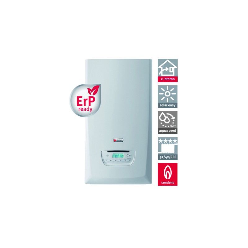 Caldaia murale a condensazione con microaccumulo e sistema Aquaspeed FAST® • Classificazione energetica 4 stelle (92/42/CEE) con rendimenti fino al 109,2% • Comfort sanitario 3 stelle (EN 13203-1), grazie all’esclusiva tecnologia Aquaspeed FAST® con scambiatore sanitario a piastre in acciaio inox e microaccumulo integrato • Produzione acqua calda sanitaria (ACS) continua fino a 20 l/min. • Solar Easy: predisposte per integrazione con impianti solari • Basse emissioni di NOx - classe 5 (EN 483) • Bruciatore a premiscelazione totale e scambiatore primario in acciaio inox anticorrosione • Circolatore ad alta efficienza e modulante • Funzione antigelo impianto riscaldamento